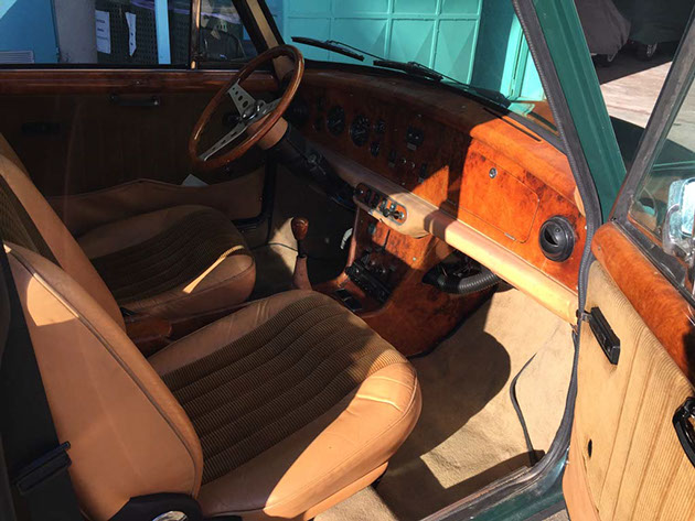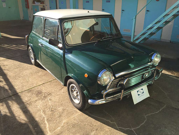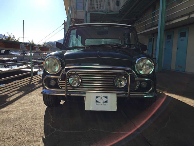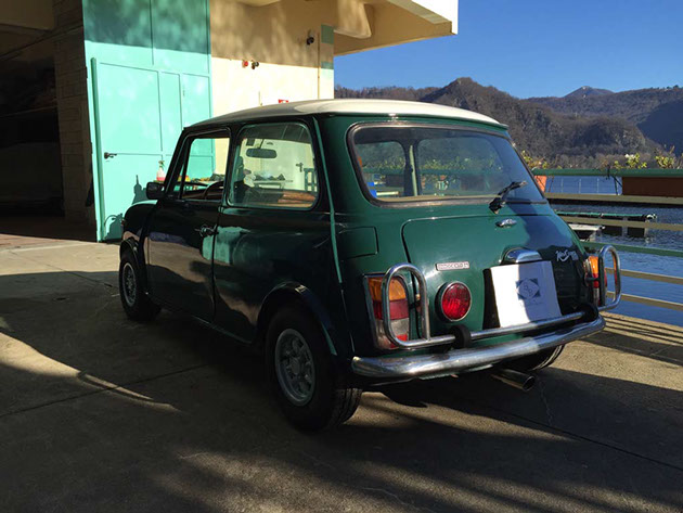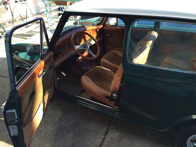 Mini Cooper con allestimento Pavesi, interni speciali in radica compreso tunnel centrale, volante e pomello del cambio in radica, sedili in pelle e velluto centrale, bracciolo, radio, tappo benzina a scomparsa, fendinebbia integrati nella griglia, cerchi in lega. Targhe nere MI. In ottimo stato di conservazione. Era una vettura molto ambita negli anni settanta.
